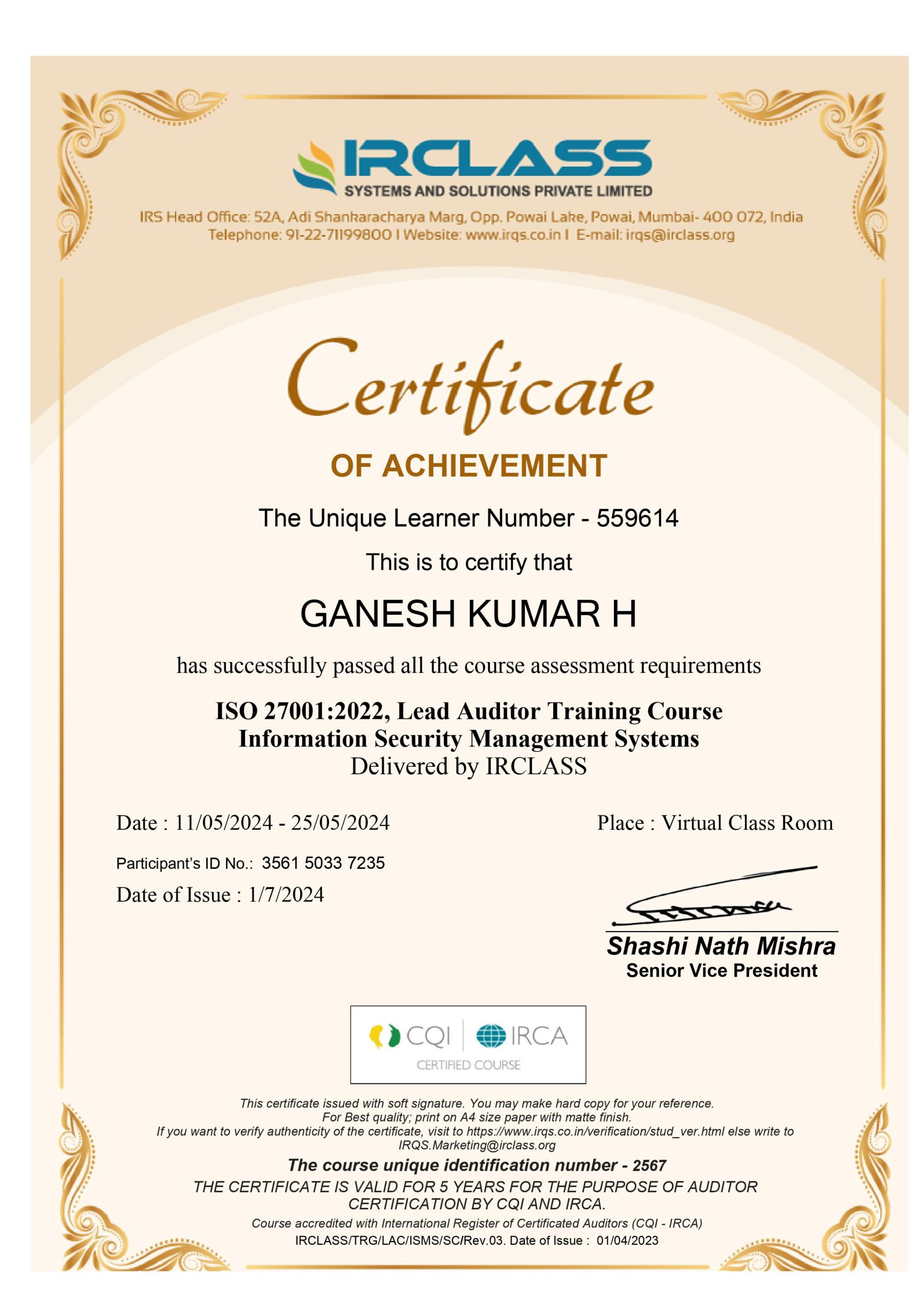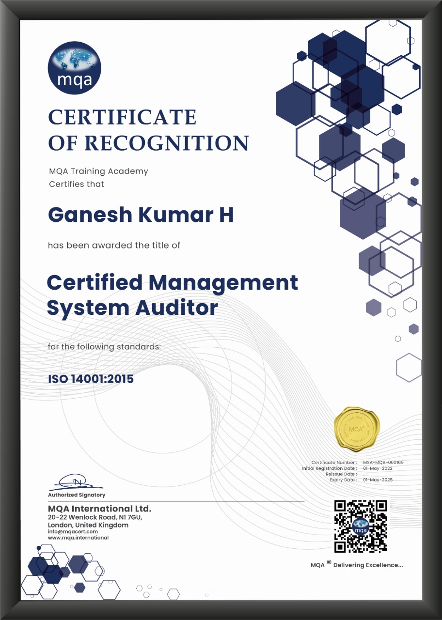 - Qualified Lead Auditor for ISO 9001 –through IRCA approved course of TQM International. NABET approved Lead auditor course for ISO 14001, OSHAS (IMS)